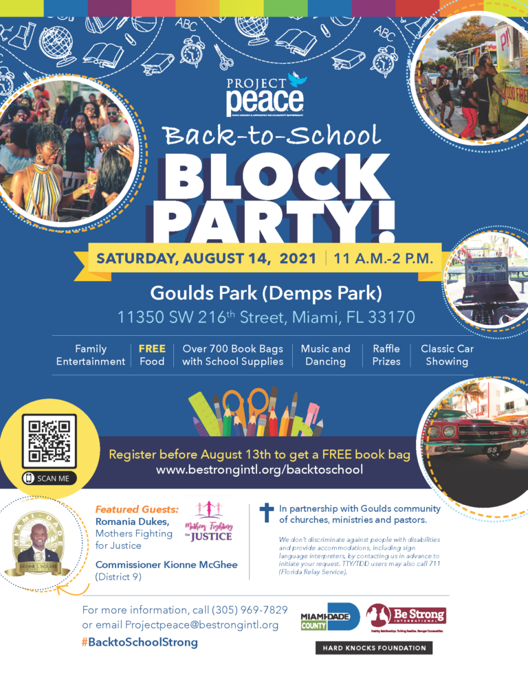 Project P.E.A.C.E. is part of a 3-year, $1 million grant initiative funded by the U.S. Department of Justice, Community-Based Crime Reduction (CBCR) Program formerly named the Byrne Criminal Justice Innovation Program. The grant is administered by the Miami-Dade County Office of Management and Budget, and executed, in part, by the efforts of Be Strong International.